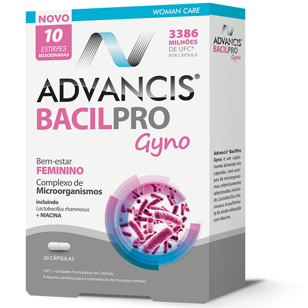 Advancis Bacilpro Gyno Cápsulas é um suplemento alimentar para prevenção de infeções vaginais, equilíbrio da mucosa vaginal e reforço do sistema imunitário e deve ser tomado em casos de prevenção de candidíase associada a antibioterapia, prevenção de vaginose bacteriana, manutenção do equilíbrio da mucosa/flora vaginal, recuperação do equilíbrio do trato gastrointestinal, promoção do equilíbrio da microbiota intestinal.